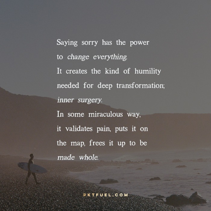 Saying sorry has the power to change everything. It paves the way for healing; ours and the person we've hurt. It creates the kind of humility needed for deep transformation, inner surgery. In some miraculous way, it validates pain, puts it on the map, frees it up to be made whole. There are other devotions I could write about forgiving and accepting, but this one is about being and saying sorry. Imagine how different our world would be if instead of walking away in pride, anger, and shame, we faced the pain we’ve created, been complicit in (willingly or not), with humility and asked for forgiveness?