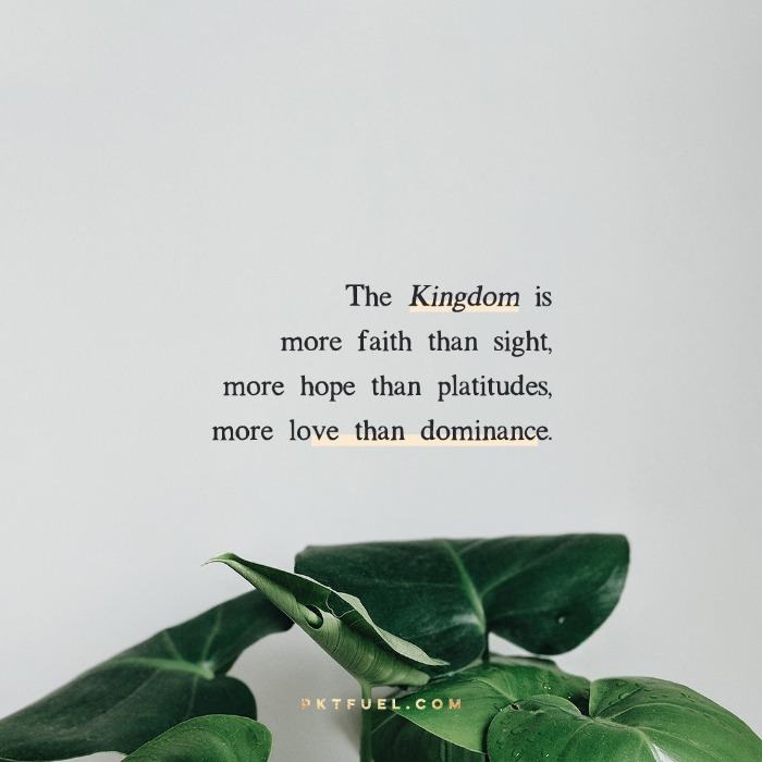 You have to flip it. God doesn’t build up – he builds down. Right into the soul. Deep into the hearts of people. And then from person to person, through faith, hope, and love; kindness and compassion, mercy and justice, forgiveness and healing (not the quick fix miracles but inner transformation) the Kingdom establishes its roots. It’s like smoke drifting through the earth, being breathed in and out; being lived into. It’s passed along by touch, not decree. It’s more faith than sight, more hope than platitudes, more love than dominance.
